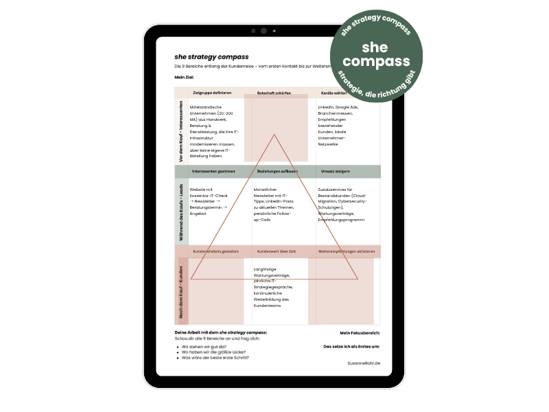 Der she strategy Compass Check ist dein Startpunkt. Wenn du jetzt Klarheit hast, wohin dein Marketing sich entwickeln soll, vertiefe das Ergebnis: